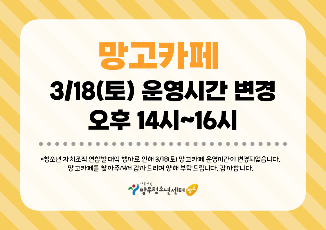 û¼Ò³â ÀÚÄ¡Á¶Á÷ ¿¬Çչߴë½Ä Çà»ç·Î ÀÎÇØ 3/18(Åä) ¸Á°íÄ«Æä ¿î¿µ½Ã°£ÀÌ º¯°æµÇ¾ú½À´Ï´Ù.
