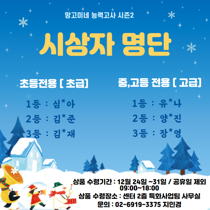 ¸Á°í¹Ì³× ´É·Â°í»ç ½ÃÁð 2 ¸¶°¨µÇ¾ú½À´Ï´Ù~~ ÃʱÞ, °í±Þ ½Ã»óÀÚ ¸í´ÜÀ» °Ô½ÃÇÏ¿À´Ï ½Ã»óÀÚ²²¼´Â 12¿ù 24ÀÏ~12¿ù 31ÀÏ 9½Ã~6½Ã »çÀÌ¿¡ ¼¾ÅÍ 2Ãþ ƯȻç¾÷ÆÀ»ç¹«½Ç ¿¡¼ »óǰÀ» ¼ö·ÉÇØ°¡¼¼¿ä~ #½Ã»óÀÚ¿¡°Ô´Â °³º° ¹®ÀÚ¸Þ¼¼Áö ¹ß¼ÛµË´Ï´Ù#