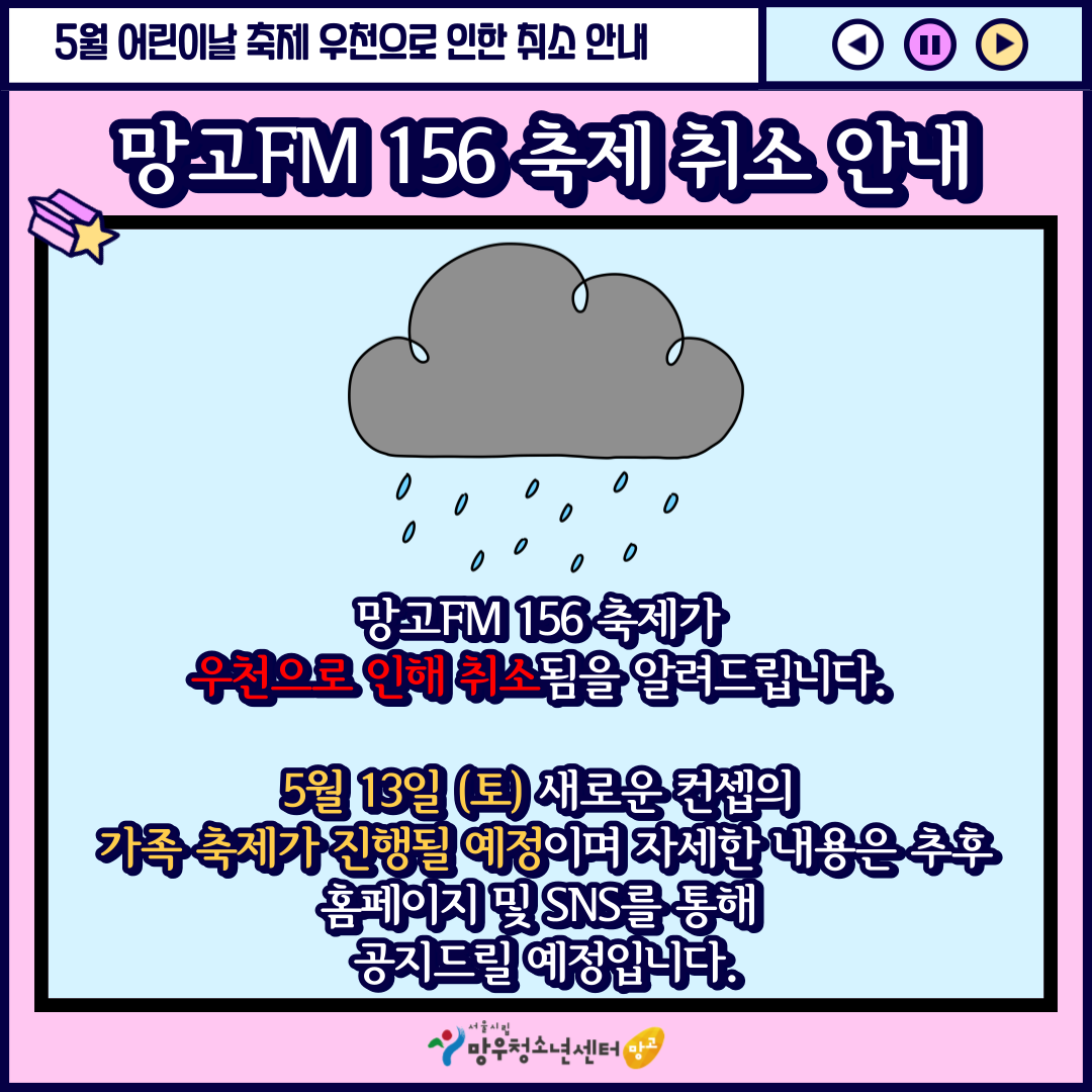 5¿ù 5ÀÏ ±Ý¿äÀÏ ¾î¸°À̳¯ ÁøÇà ¿¹Á¤ÀÌ¿´´ø ¾î¸°À̳¯ ÃàÁ¦ ¸Á°íFM 156 ÃàÁ¦´Â ºñ ¿¹º¸·Î ÀÎÇØ Ãë¼ÒµÇ¾ú½À´Ï´Ù.