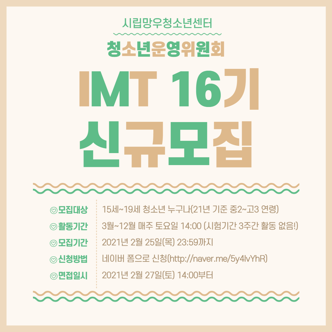 ¸Á¿ìû¼Ò³â¼¾ÅÍ¿¡¼ 2021³â û¼Ò³â¿î¿µÀ§¿øÈ¸ IMT 16±â ½Å±Ô À§¿øÀ» ¸ðÁýÇÕ´Ï´Ù!! ¸¹Àº ½Åû ¹Ù¶ø´Ï´Ù😀