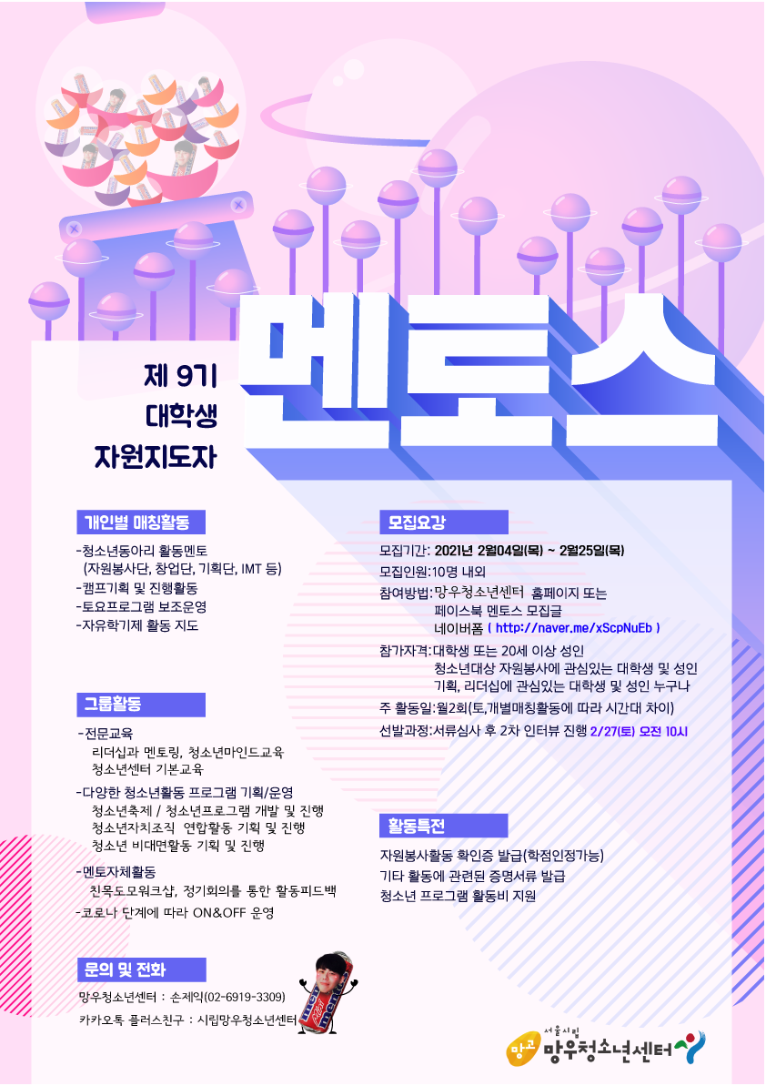 ½Ã¸³¸Á¿ìû¼Ò³â¼¾ÅÍ ´ëÇлýÀÚ¿øÁöµµÀÚ´Ü ¸àÅ佺 9±â ½Å±Ô´Ü¿øÀ» ¸ðÁýÇÕ´Ï´Ù! 2021³â ÇÑÇØµ¿¾È ÁöµµÀڷμ û¼Ò³âµé°ú ÇÔ²² ON & OFF¿¡¼ ·¹Àüµå±Þ Ãß¾ïÀ» ¸¸µé°í Áöµµ·Â,±âȹ·Â,Ȱµ¿·ÂÀ» Ű¿ì°í½ÍÀº ´ëÇÐÀçÇлý+½ÅÀÔ»ý+ÈÞÇлý+¼ºÀκеé ÁÖÀúÇÏÁö¸¶½Ã°í!! ¸¹À̸¹ÀÌ ½ÅÃ»ÇØÁÖ¼¼¿ä^^ 2021³â¿¡´Â ¾Ë¹Ùº¸´Ù °ÔÀÓº¸´Ù µ¥ÀÌÆ®º¸´Ù º¸¶÷Â÷°í »ÑµíÇÑ ¸àÅ佺