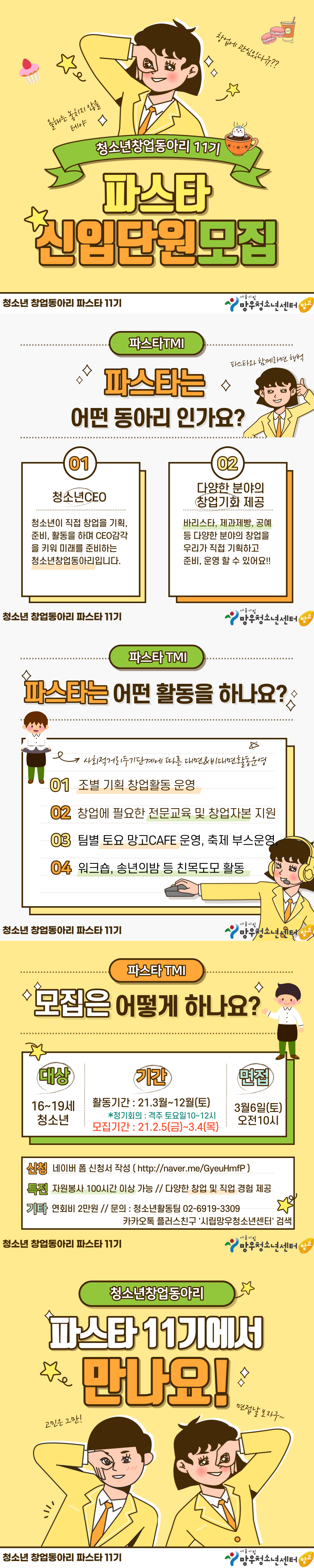 û¼Ò³ââ¾÷µ¿¾Æ¸® ÆÄ½ºÅ¸ 11±â ¸ðÁý û¼Ò³âµéÀÌ Á÷Á¢ â¾÷À» ±âȹÇϰí Áغñ, ¿î¿µÇغ¸°í ½Í´Ù¸é? ¿ì¸®°¡ ¿î¿µÇÏ´Â ¸Á°íCAFE´Â °ú¿¬ ¹Ì½¶·© º° ¸î°³?! û¼Ò³âµéÀÇ ÈûÀ¸·Î â¾÷¿¡ µµÀüÇØº¸°í ½ÍÀº °úÀÇ¿å, µµÀüÁ¤½ÅÅõö, ´ú··ÀÌ, ³ÃöÇѺм®°¡ Ä£±¸µé ¸ðµÎ¸ðµÎ ½Åû ²Ù¿í ¸ðÁý´ë»ó : 16~19¼¼ û¼Ò³â ¸ðÁý±â°£ : ~ 21.03.04(¸ñ) ±îÁö ¸ðÁý¹æ¹ý : ³×À̹ö Æû Á¦Ãâ ( naver.me/GyeuHmfP ) ¸éÁ¢ÀÏÀÚ : 21.03.06(Åä) ¿ÀÀü10½Ã ±âŸ»çÇ× : ¿¬È¸ºñ 2¸¸¿ø ƯÀü³»¿ë : À§ÃËÀå, ºÀ»ç½Ã°£ ¹®ÀÇ»çÇ× : û¼Ò³âȰµ¿ÆÀ 02-6919-3309 īī¿ÀÅå Ç÷¯½º Ä£±¸ '½Ã¸³¸Á¿ìû¼Ò³â¼¾ÅÍ' °Ë»ö! ( pf.kakao.com/_nXNeK )