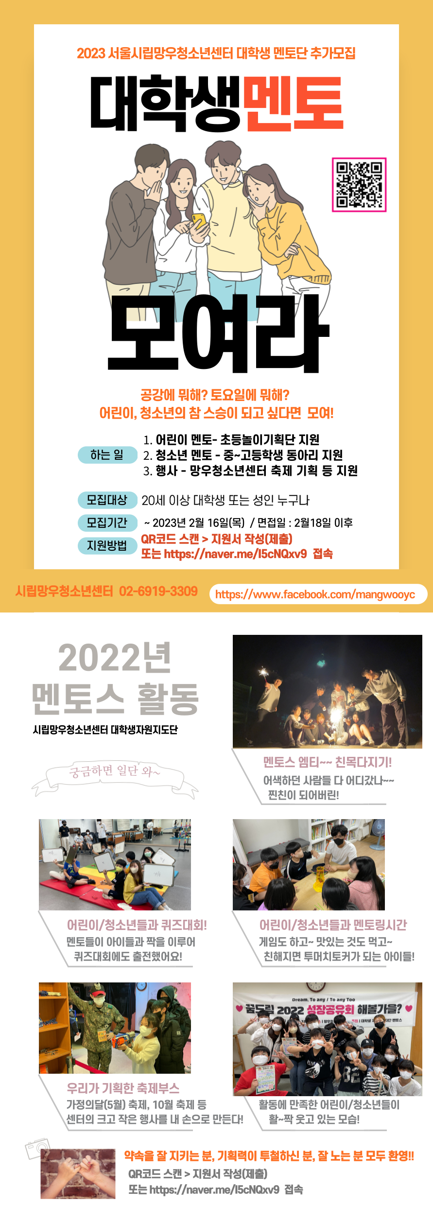 2023³âµµ ´ëÇлý ÀÚ¿øÁöµµ´Ü "¸àÅ佺 11±â"¸¦ Ãß°¡¸ðÁýÇÕ´Ï´Ù.¾î¸°ÀÌ, û¼Ò³âÀÇ ½º½Â, Ä£±¸, ¸àÅä°¡ µÇ¾îÁÖ½Ç ºÐµéÀÇ ¸¹Àº °ü½É ºÎʵå·Á¿ä~!! ¢º Áö¿ø¼ ÀÛ¼º : https://naver.me/I5cNQxv9