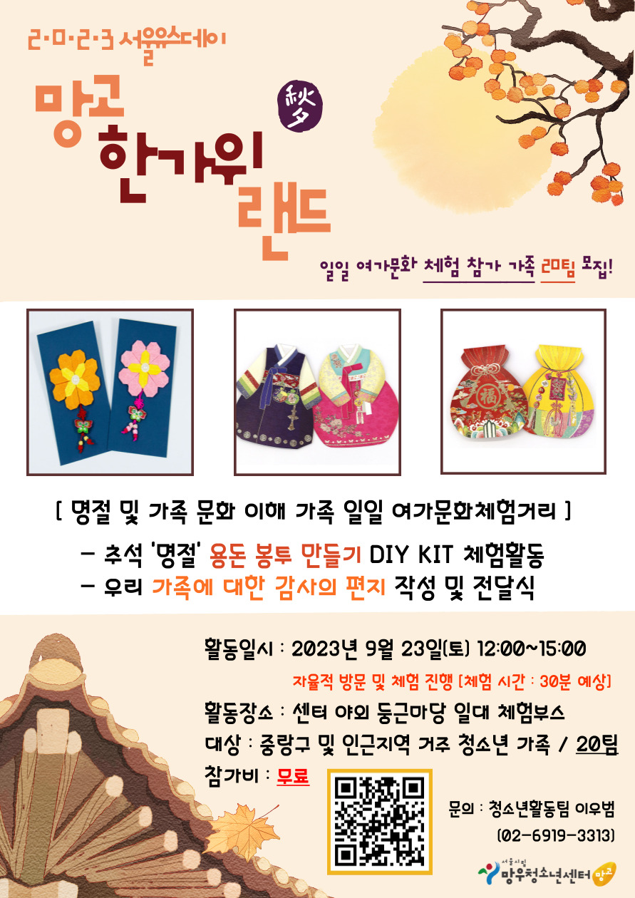 ¿ì¸®³ª¶ó ´ëÇѹα¹ ´ëÇ¥ ¸íÀý 'Ãß¼®'À» ±â³äÇÏ¿© ½Ã¸³¸Á¿ìû¼Ò³â¼¾ÅÍ¿¡¼ °¡Á·°ú ¸íÀýÀÇ Àǹ̸¦ ÀÏƒÆ¿ï ¼ö ÀÖ´Â °¡Á·´ÜÀ§ ÀÏÀÏ ¿©°¡¹®ÈüÇè ÇÁ·Î±×·¥ !! 😎