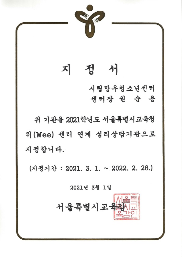 ¸Á¿ìû¼Ò³â¼¾ÅÍ ²ÞÅͽɸ®»ó´ã½ÇÀº ¼¿ïƯº°½Ã±³À°Ã» Wee¼¾ÅÍ ¿¬°è ½É¸®»ó´ã±â°üÀ¸·Î ÁöÁ¤µÇ¾ú½À´Ï´Ù!