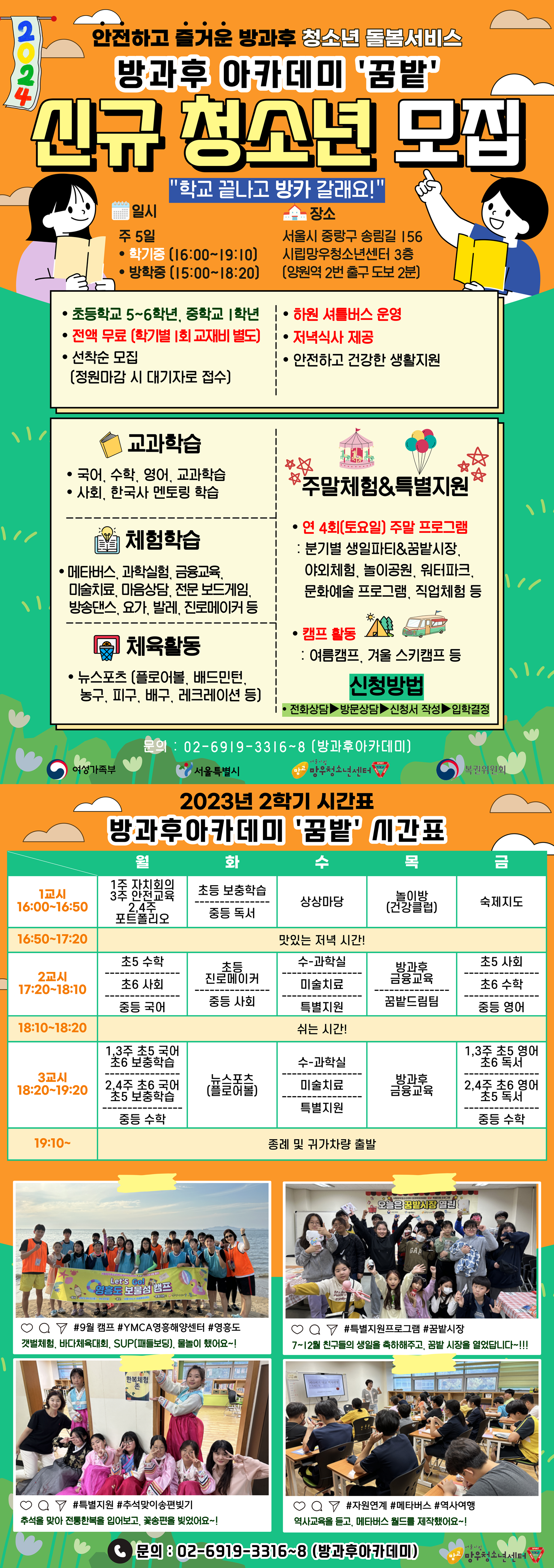 1) ±³°úÇнÀ - ±¹¾î, ¿µ¾î, ¼öÇÐ Àü¹®°»ç ÇнÀÁö¿ø 2) ÁÖÁßüÇè ¹× Àڱⰳ¹ß Ȱµ¿ - ¸ÞŸ¹ö½º, °úÇб³½Ç, °ÔÀÓ¸®ÅÍ·¯½Ã, ´º½ºÆ÷Ã÷(¹èµå¹ÎÅÏ), ¹æ¼Û´í½º, ¹ß·¹, ¿ä°¡, Àμº±³À°, ¿ä¸®, º¸µå°ÔÀÓ, ¾ÈÀü±³À°, µ¶¼, ÀÚġȸÀÇ µî 3) Ä·ÇÁ¡¤Æ¯º°Áö¿ø - ÁÖ¸»Ã¼Çè(¿¬Áß 4ȸ), Ä·ÇÁ(¿¬Áß 2ȸ), »ýÀÏÆÄÆ¼(¿¬Áß 4ȸ), ²Þ¹ç½ÃÀå(¿¬Áß 4ȸ) µî 4) ±Þ½Ä ¹× ±Í°¡Áöµµ - ¼®½Ä Áö¿ø ¹× ÇÏ¿ø ¼ÅƲ¹ö½º ¿î¿µ(* ¿îÇà½Ã°£ - 19:10~20:00)