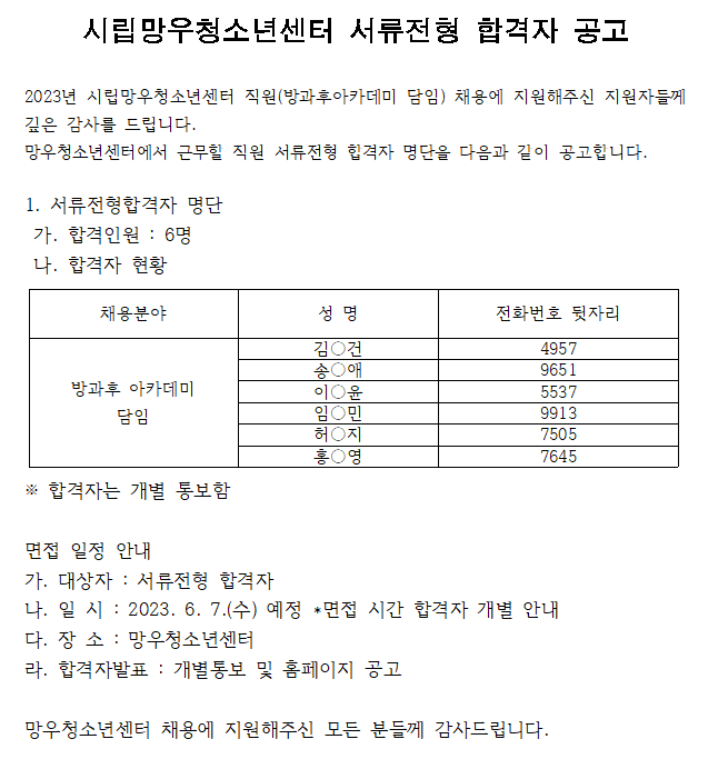 ½Ã¸³¸Á¿ìû¼Ò³â¼¾ÅÍ Á÷¿ø ä¿ë ÃÖÁ¾ ÇÕ°ÝÀÚ °ø°í