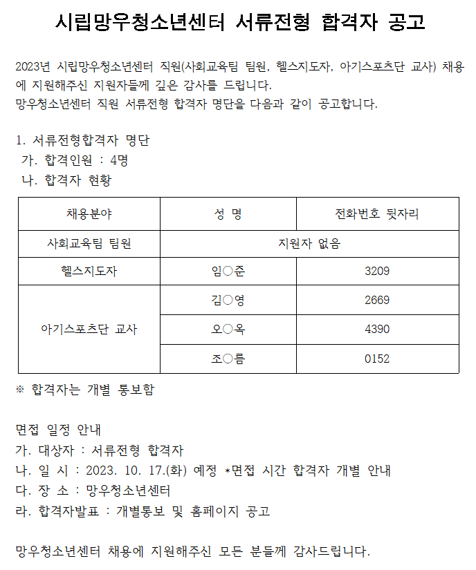 ½Ã¸³¸Á¿ìû¼Ò³â¼¾ÅÍ Á÷¿ø(»çȸ±³À°ÆÀ ÆÀ¿ø, ÇコÁöµµÀÚ, ¾Æ±â½ºÆ÷Ã÷´Ü ±³»ç) ä¿ë ¼·ùÀüÇü ÇÕ°ÝÀÚ °ø°í