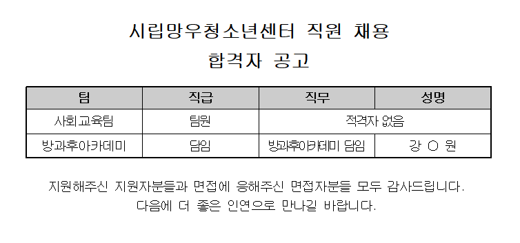 ½Ã¸³¸Á¿ìû¼Ò³â¼¾ÅÍ Á÷¿ø(»çȸ±³À°ÆÀ ÆÀ¿ø, ¹æ°úÈľÆÄ«µ¥ÀÌ ´ãÀÓ) ä¿ë ÃÖÁ¾ ÇÕ°ÝÀÚ °ø°í
