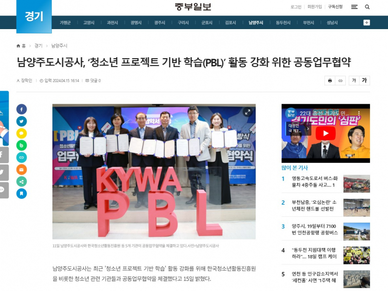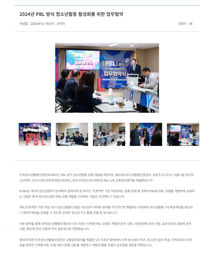 ½Ã¸³¸Á¿ìû¼Ò³â¼¾ÅÍ, °æ»ó³²µµÃ»¼Ò³âȰµ¿ÁøÈï¼¾ÅÍ, ³²¾çÁÖµµ½Ã°ø»ç, ¾È»ê½Ãû¼Ò³âÁø·ÎüÇèÁö¿ø¼¾ÅÍ, Àϻ꼱¸Ã»¼Ò³â¼ö·Ã°ü°ú Çѱ¹Ã»¼Ò³âȰµ¿ÁøÈï¿ø(KYWA)Àº ¾÷¹«Çù¾àÀ» ÅëÇØ ¾ÕÀ¸·Î ´Ù¾çÇÑ PBL(ÇÁ·ÎÁ§Æ® ±â¹Ý ÇнÀ) û¼Ò³âȰµ¿ ¸ðµ¨À» °³¹ßÇÏ°í ¿î¿µÇÏ°Ô µÉ ¿¹Á¤ÀÔ´Ï´Ù ( •̀ᴗ•́ )و ̑̑
