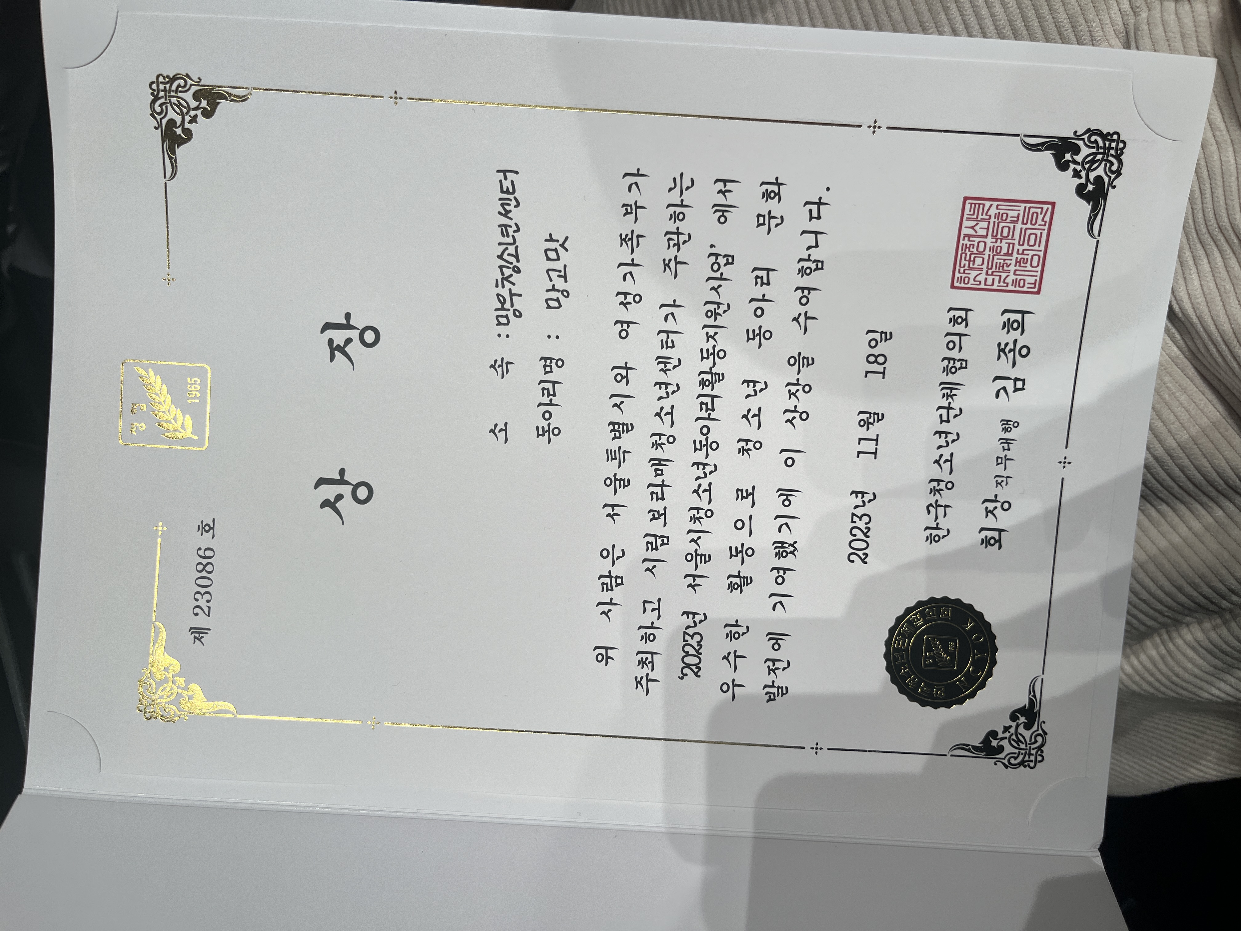 ❤Çѱ¹Ã»¼Ò³â´ÜüÇùÀÇȸÀå»ó ¼ö»ó❤